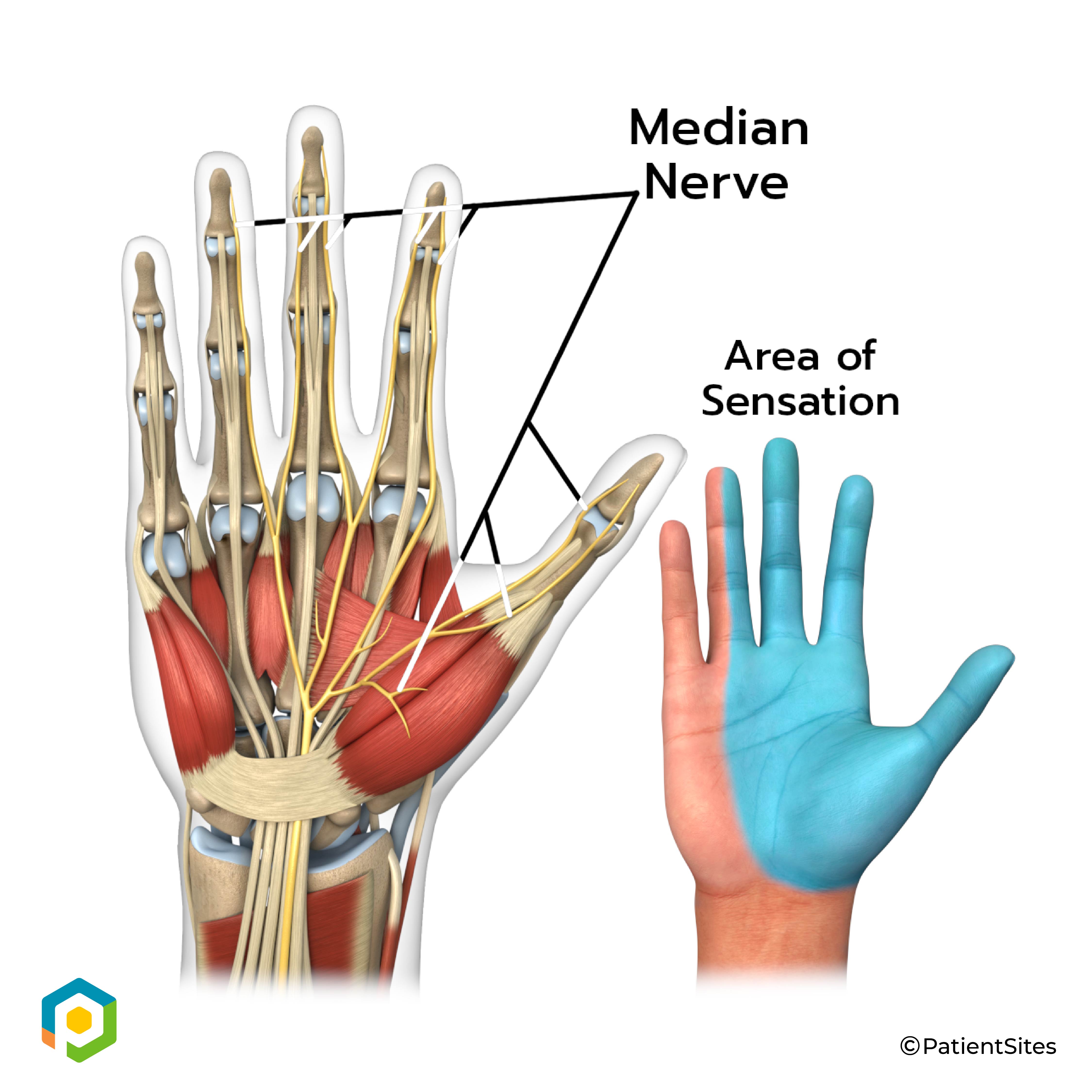 The travels through a tunnel within the wrist called the carpal tunnel. The median nerve gives sensation to the palm sides of the thumb, index finger, long finger, and half of the ring finger. It also sends a nerve branch to control the thenar muscles of the thumb. The thenar muscles help move the thumb and let you touch the pad of the thumb to the tips each of each finger on the same hand, a motion called opposition.